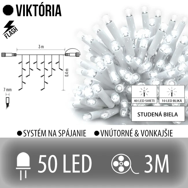Viktória spojovateľná led svetelná záclona vonkajšia flash - 50led - 3m studená biela / flash prebliknutie studená biela - biely kábel