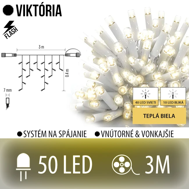 Viktória spojovateľná led svetelná záclona vonkajšia flash - 50led - 3m teplá biela / flash prebliknutie teplá biela - biely kábel