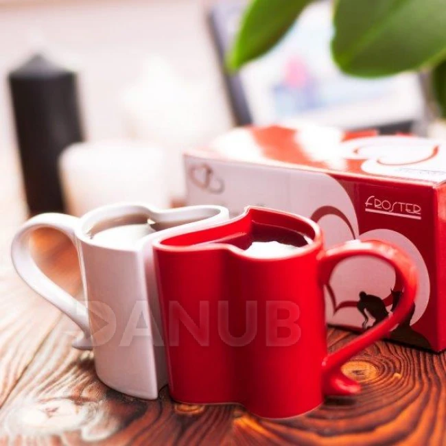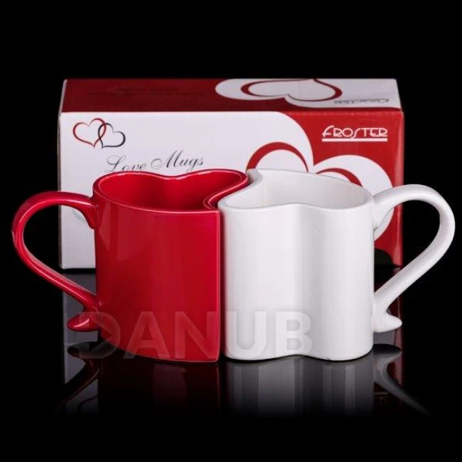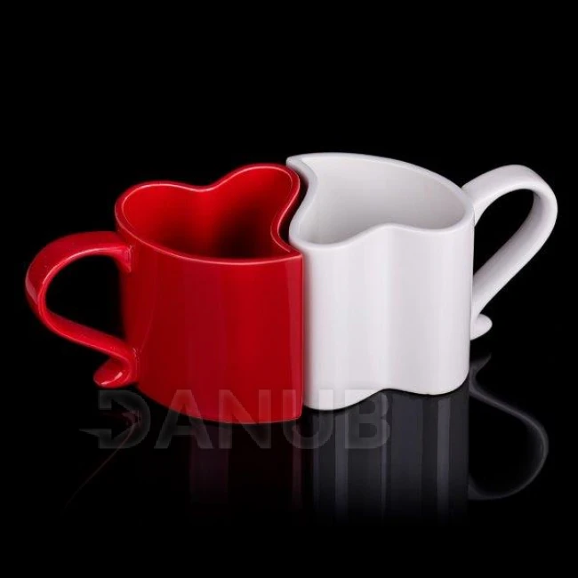 Dva romantické hrnčeky v tvare srdca, ktoré k sebe dokonale pasujú.